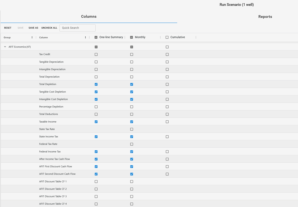 ‘AFIT Economics’ collapsable list within the ‘Columns’ tab. This allows outputs