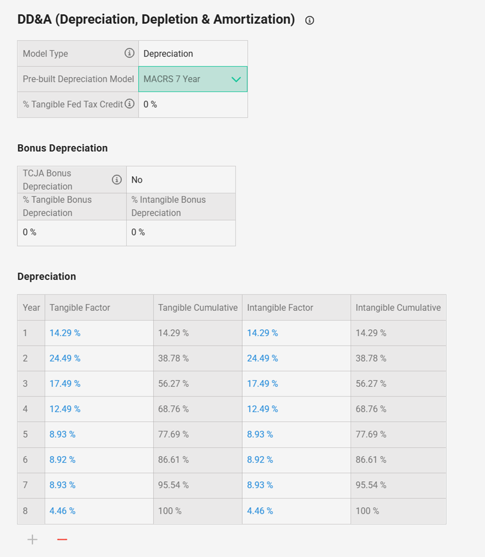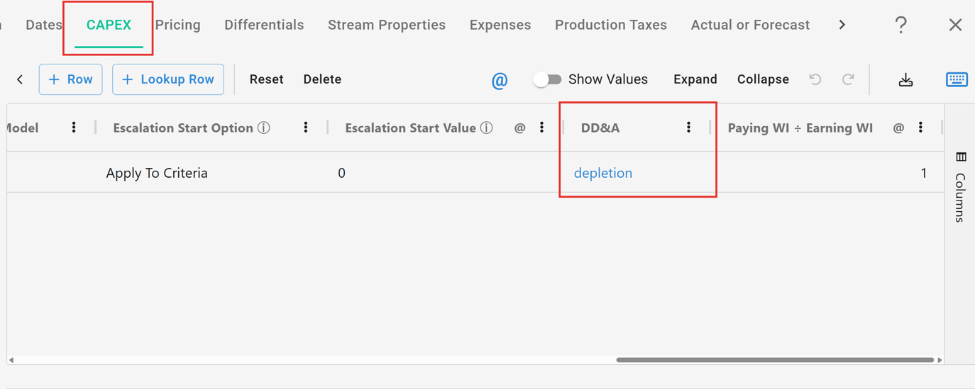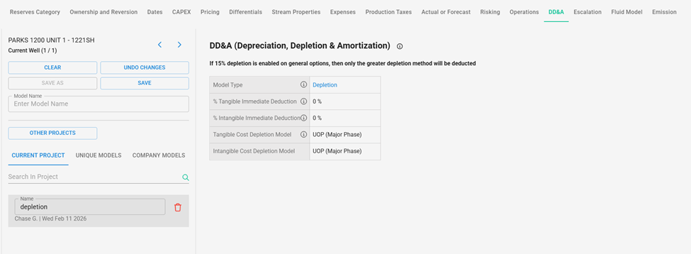 model will be selectable in the DD&A column.
