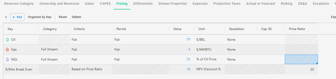 - Input a discount rate and a oil/gas price ratio (ratio not required if using a "Direct" criteria)
