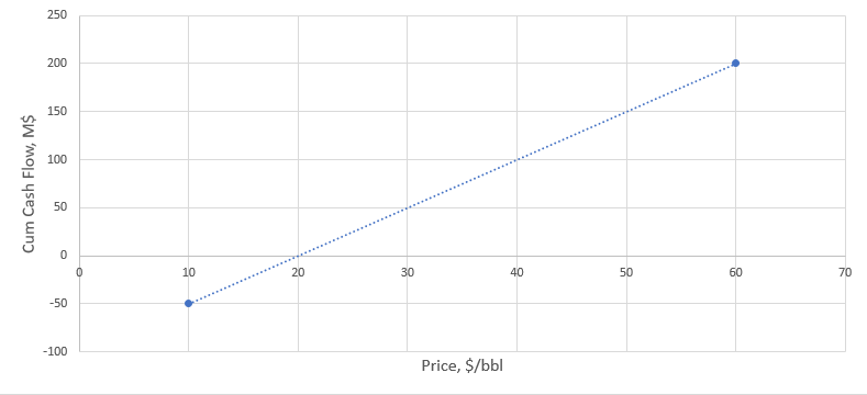 - Assume a linear relationship between oil price and cum cash flow from the 2 oil prices [10,60] and the 2 cum cash flows [cum1,cum2] to calculate the oil price that will result in 0 cum cash flow