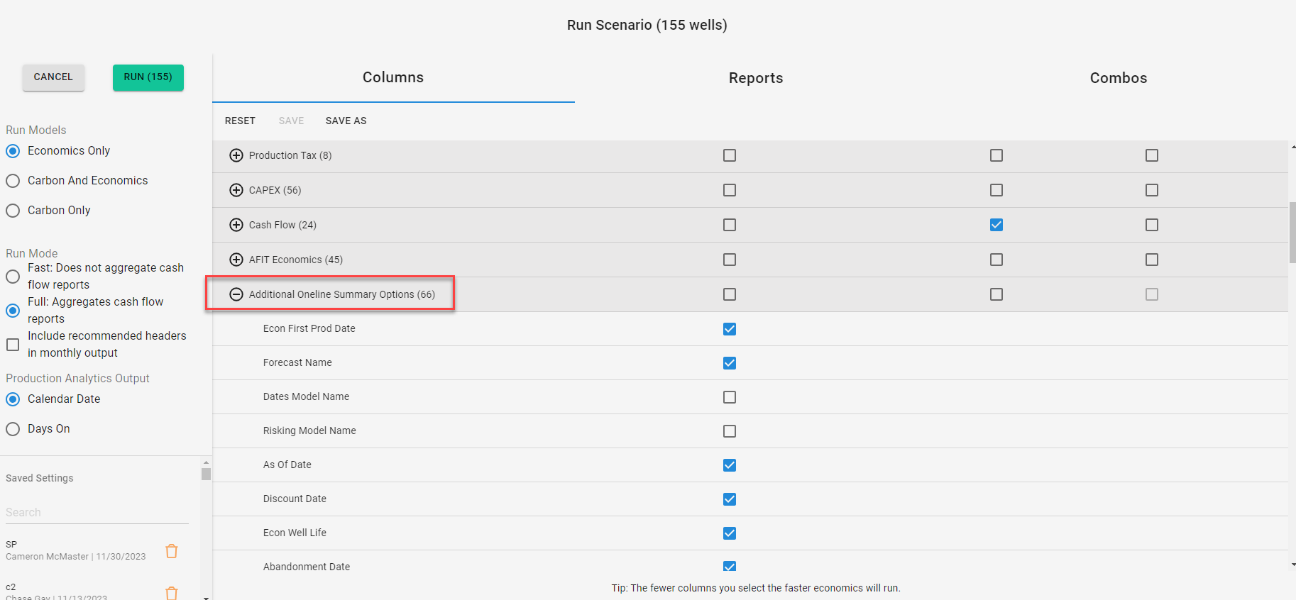 Custom CSV Generation Summary After completing a scenario run, the “Export” dropdown has been updated. In addition to the previously existing CSV export options (Well Oneline, Well Monthly Cashflow, Well Yearly Cashflow, Aggregate Monthly Cashflow, ...