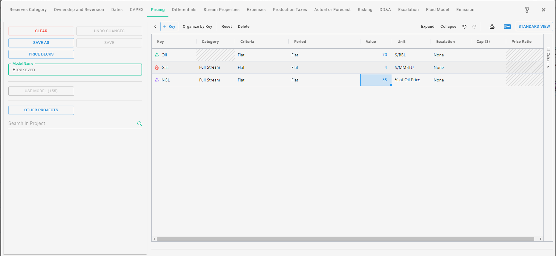 In the example below, we are calculating Breakeven price based on a 10% discount rate and 20 oil/gas price Ratio