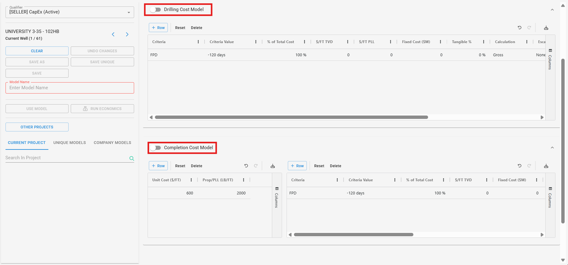 The Drilling Cost Model and Completion Cost Model can be found in the Capex standard view. These models allow to generate a drilling or completion capital cost based on the individual well design. You can toggle the models on to type in the respective values.
