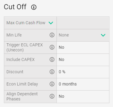 These cut off settings controls the end to economic life (ECL) based on criteria triggers. Note that all CC Cut Off methods have a profitability test whereby wells that are non-accretive (have negative NPV) are zeroed out economically. If this test is not wanted, a Min Life may be used as an override.