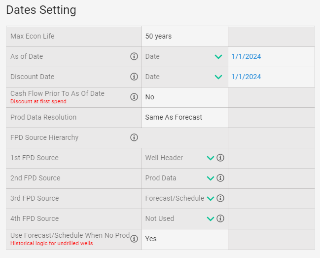 - Oil Rate, Gas Rate, Water Rate: Cut economics off when the prod stream reaches the specified rate