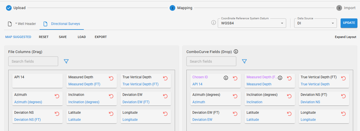 Finally click upload, now onto the header mapping page. Just like production data mapping headers, mapping our directional survey file headers to our ComboCurve headers is crucial. Again the minimum required headers for a import to be successful are colored in purple. Drag and drop the headers on the left (Uploaded File Headers) to the right (ComboCurve headers). The screenshot below shows an example of a fully mapped out Directional Survey header.