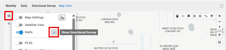 If directional survey information is not appearing it is possible it is turned off in the map view. To turn it on, simply click the layers option and enable the directional surveys to be shown.