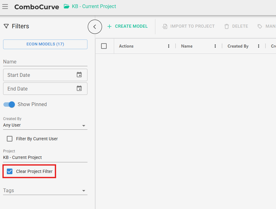 Open Econ Model Module in your current project and then uncheck the Clear Project Filter on the left side. You can search for the econ model you are wanting to import by Name, User, Project and/or Tags. Once you find the Econ Model(s) you are wanting to import, check the box next to their name and select Import to Project.