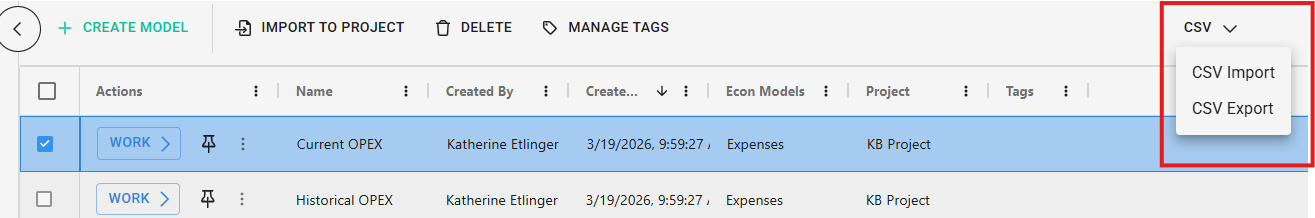 One use for this is to mass edit a certain economic assumption category. To do this you would CSV export only one category, save to your computer, and edit the models. Then reimport that CSV file with CSV import. Note: You cannot edit names of economic models here. If you import changed model names it will import them as new models.