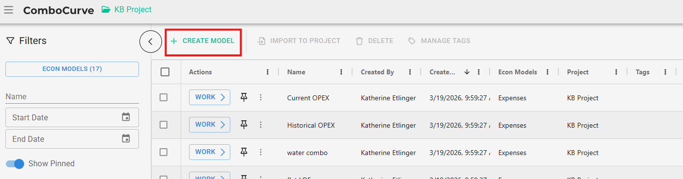 To create a model within Econ Models Module, select See All on Econ Models. Then click +Create Model. Here you can tab over to the model you want to create and edit existing models.