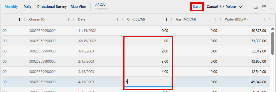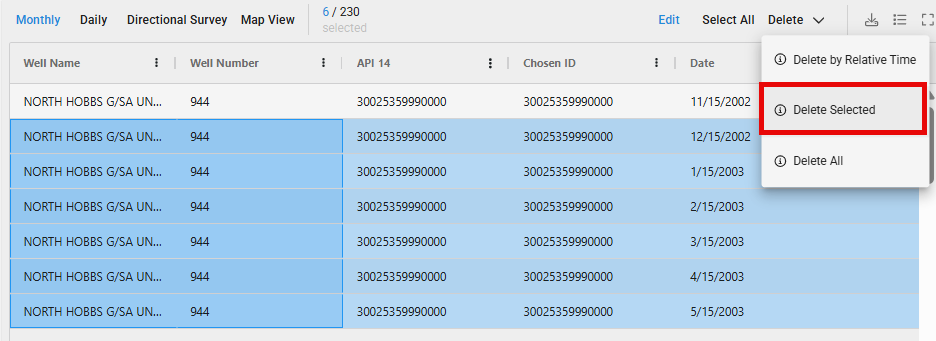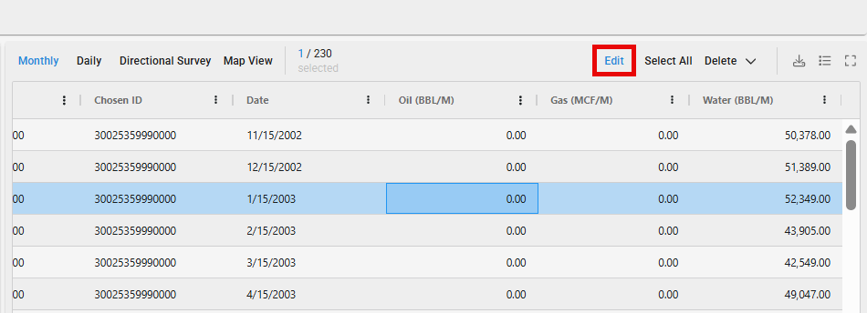 The goal of this document is to show how to manipulate a well's monthly or daily production data using the wells table. Here we can edit and delete production data without the need to reimport a well's production history.