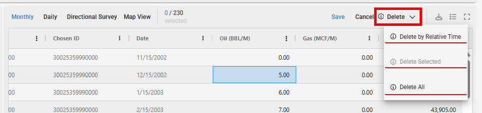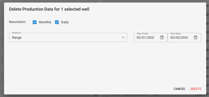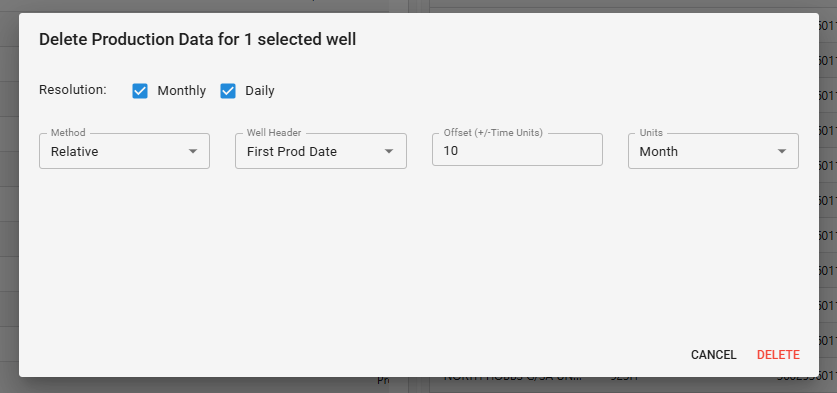 Important note: The Data Resolution toggle sets which data will be deleted. So if Monthly is toggled on it will only delete values from the monthly production. If both daily and monthly are selected, then it will delete for both data sets.