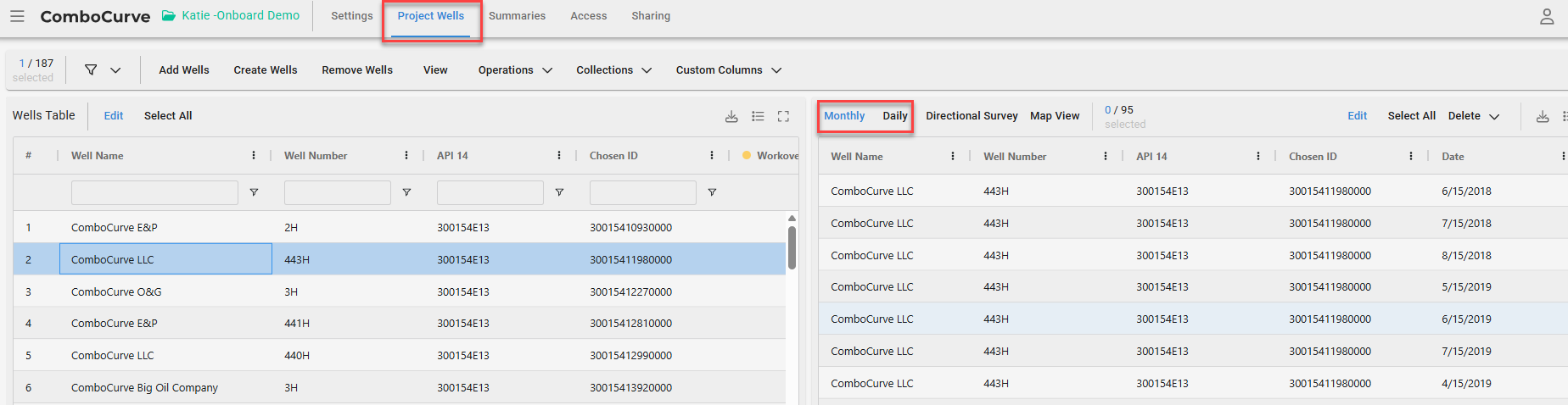 All well production data is available in the Project Wells tab across all ComboCurve modules. Select or filter wells in the Wells Table, the left-hand table, to display their production data in the Production Table, the right-hand table. You can switch between Monthly and Daily data by using the toggle at the top of the Production Table.