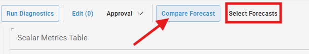 Lastly, we also have the capability to compare your forecast rollup volumes. Navigate to the top of the screen and toggle on the "compare forecast" button. Then click on "select forecasts."