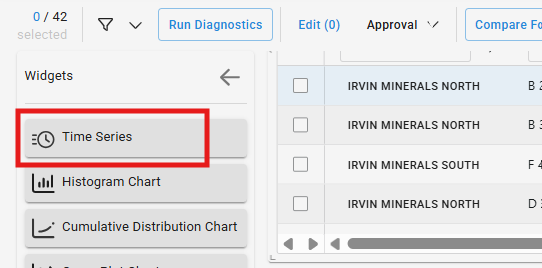 Roll-Ups can now be generated using the time-series table within diagnostics. We can use the time-series table by first selecting the time-series widget and dragging it onto our diagnostics dashboard.