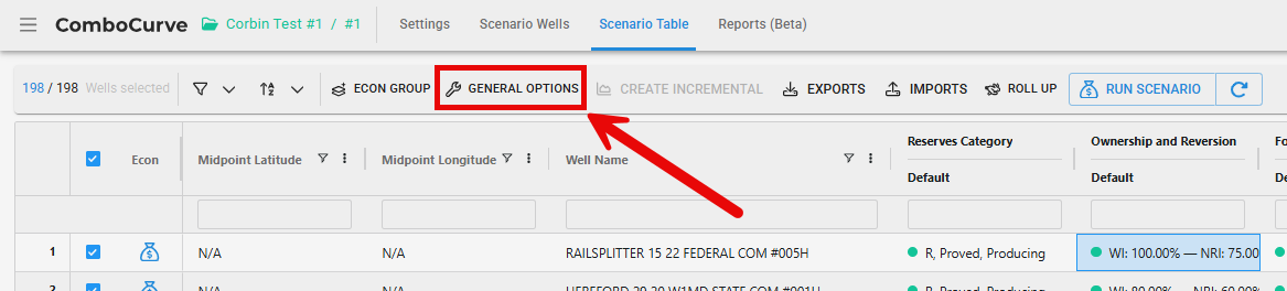 In this article we will discuss the General Options model within ComboCurve. General Options can be found in the top toolbar above the scenario table: