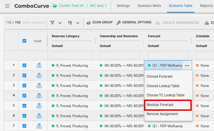 In ComboCurve’s Scenarios page, accessing and editing a well’s forecast is made easy using the Modular Forecast function. To open a well’s forecast from the Scenario page: navigate to the Forecast column, click the three-dot menu next to the desired forecast, and select Modular Forecast.
