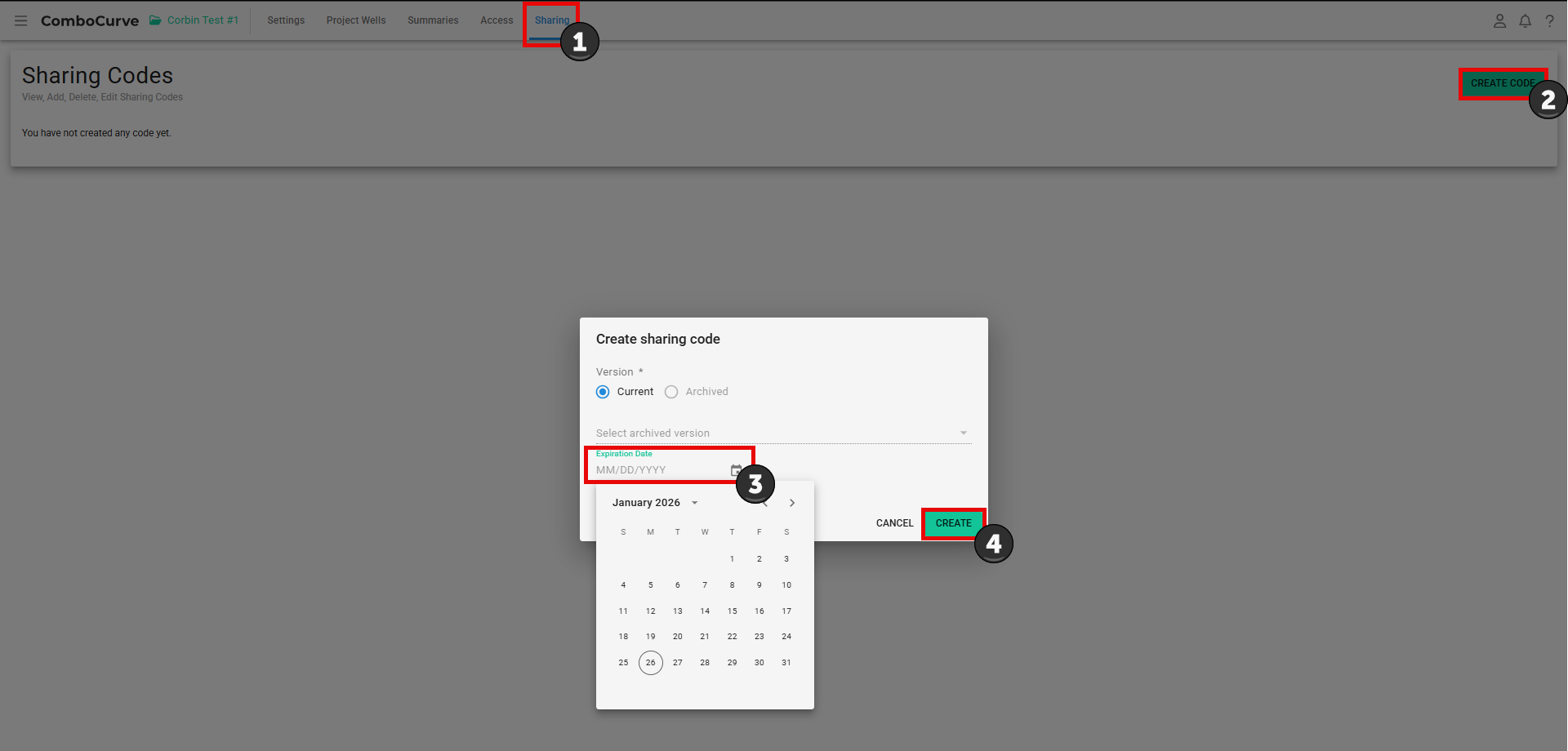 Start by opening the project you would like to share, navigate to the Sharing tab, and select Create Share Code. You can then select the version of the project you would like copied as well as set an expiration date if needed.