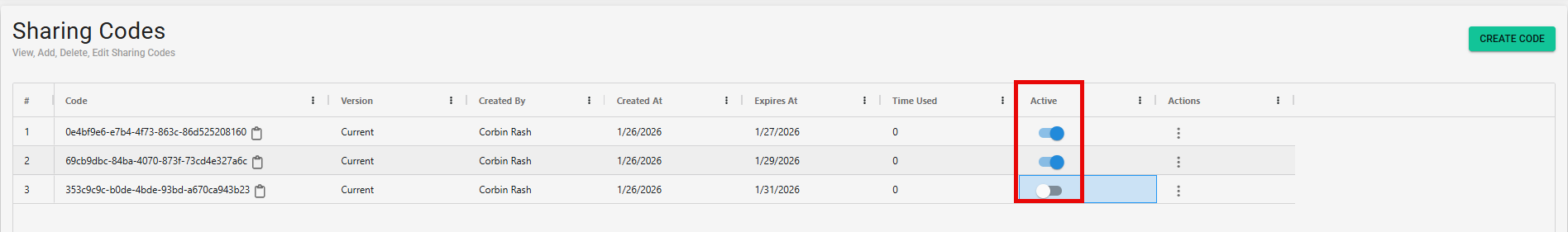 After creating the Share Code, it will appear in the view table on the Sharing tab. Click the clipboard icon next to the code to copy it for sharing. The table also displays details for each code, including the creator and expiration date. Use the toggle to active or deactivate a code. When a code is toggled off, it cannot be used.