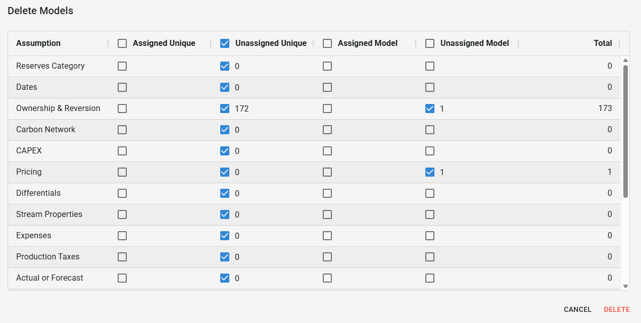 Recommended Use: If you want to clean up unique models without affecting your project level models, only check the unique model columns for the relevant assumption types.