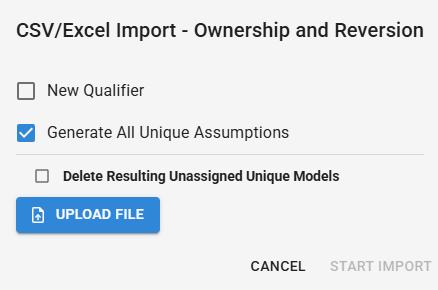 - Check Generate All Unique Assumptions during import. ComboCurve will automatically create a new unique model for every well in the file, regardless of what is currently assigned. This will not remove or alter existing project level models or other unique models — it only adds new unique models.