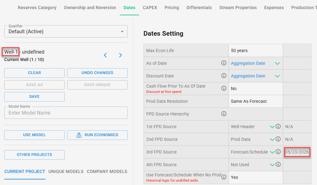 Date based on the schedule is referenced in that well’s specific date model. The "Forecast/Schedule" option will honor the Schedule first if one is applied, if not then will use the start of the Forecast date. It is advised that if the Schedule date is the intended then to set this as the 1st FPD Source. This hierarchy can be changed through the dropdown to select different sources.