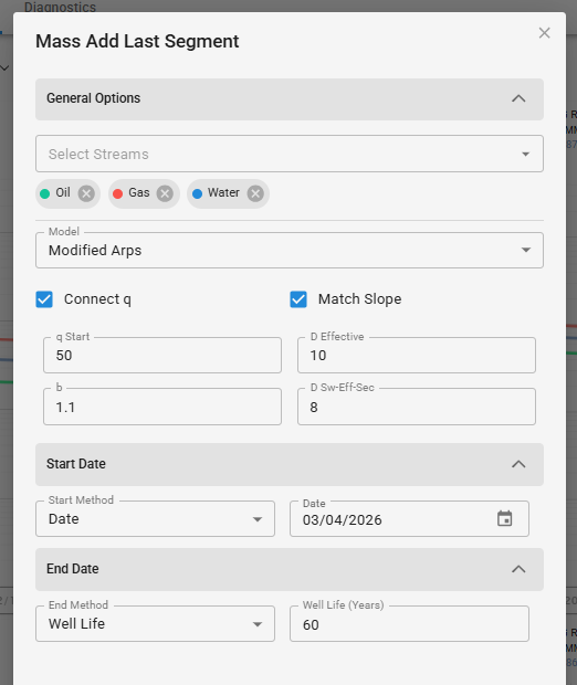 When ending the segment, a user has a few options date, duration, well life, q final. Date allows the user to input an end date. Duration allows the user to input a length for the added segment. Well life will consider the full wells production and end the new segment when the well life is met. Finally, q final will end the segment at a given flow rate.