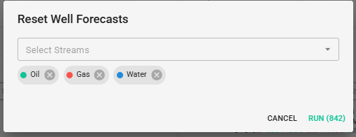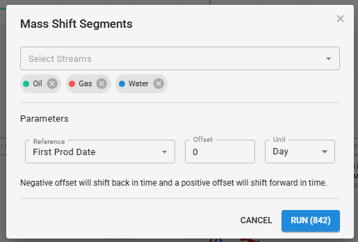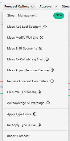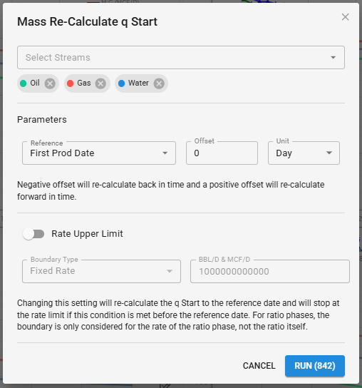 Mass re-calculate q start will allow the user to project a forecast back in time prior to the current starting rate of the forecast. The user can do all or a selected number of streams to re-calculate the q start. The user has several options when selecting a reference date from the production dates, a wells header first production date, or even a fixed date. The user also has the ability to offset from this date and select the units of this offset.