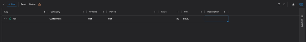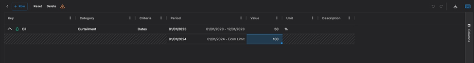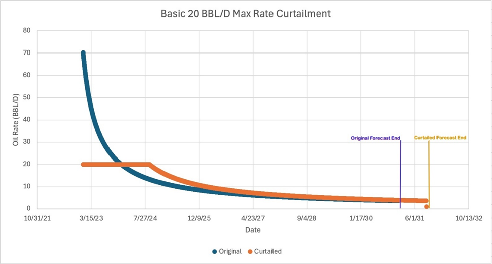 This example is modeling a flat 20 BBL/D curtailment on oil. As we curtail the volumes, the curve is “shifted” forward in time (later in time). In July 2024, we see the curve drops below the constrained rate and begins an interpolated decline generated from the cum-capacity array.