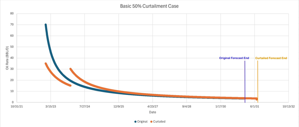 This example is modeling a 50% curtailment from 1/1/2023 to 12/31/2023. It follows the general shape of the original curve but at a lower rate and then shifts to 100% on 1/1/2024. At the shift, it is now interpolating at a higher rate because the cumulative volume is lower compared to the original curve at the same point in time. As a result, the curtailed volumes are effectively added onto the whole curve mathematically for each and every time period onward.